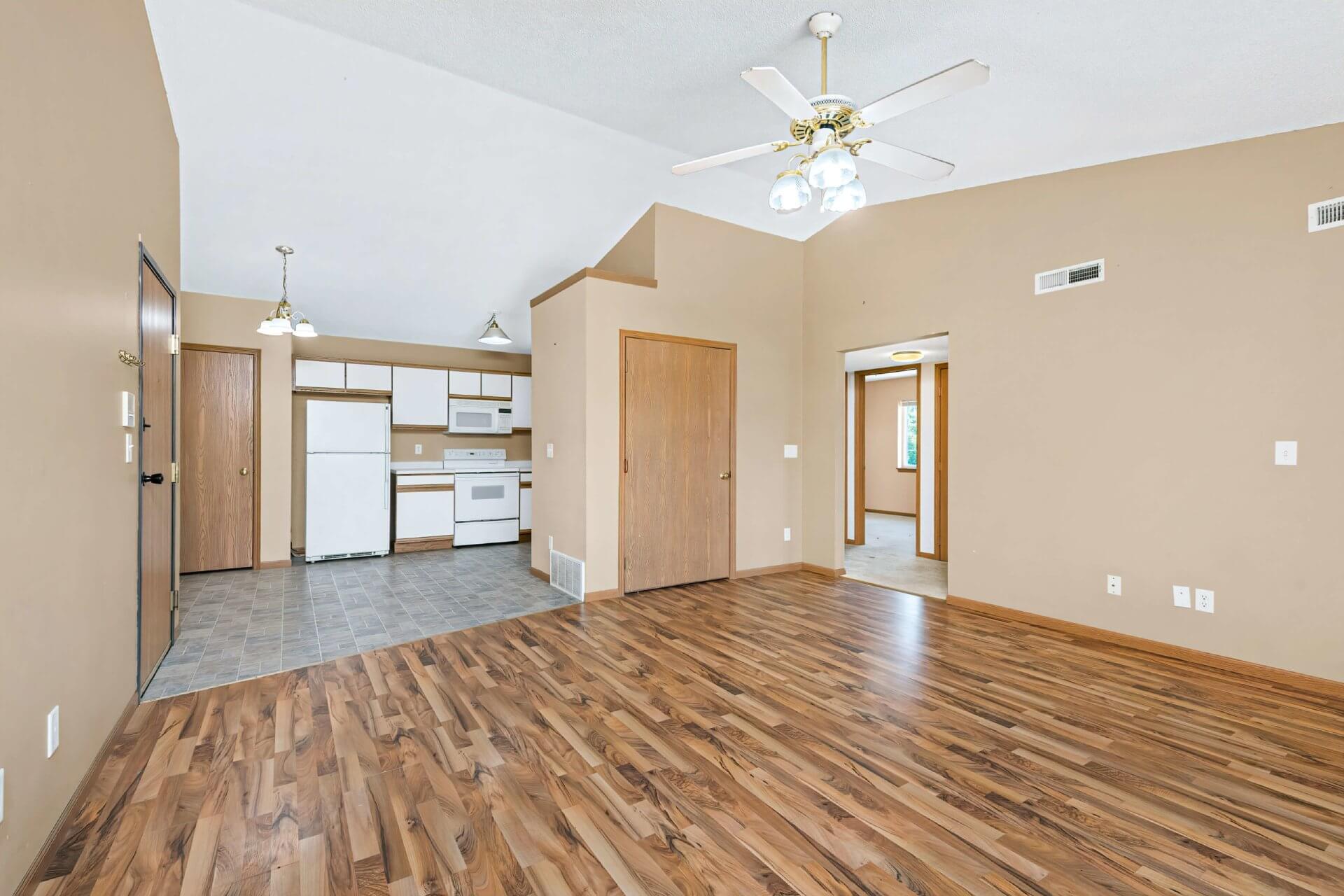 This 950 sq. ft. condominium features two bedrooms, an in-unit washer and dryer, an attached patio area, and a covered one-car garage for added convenience.